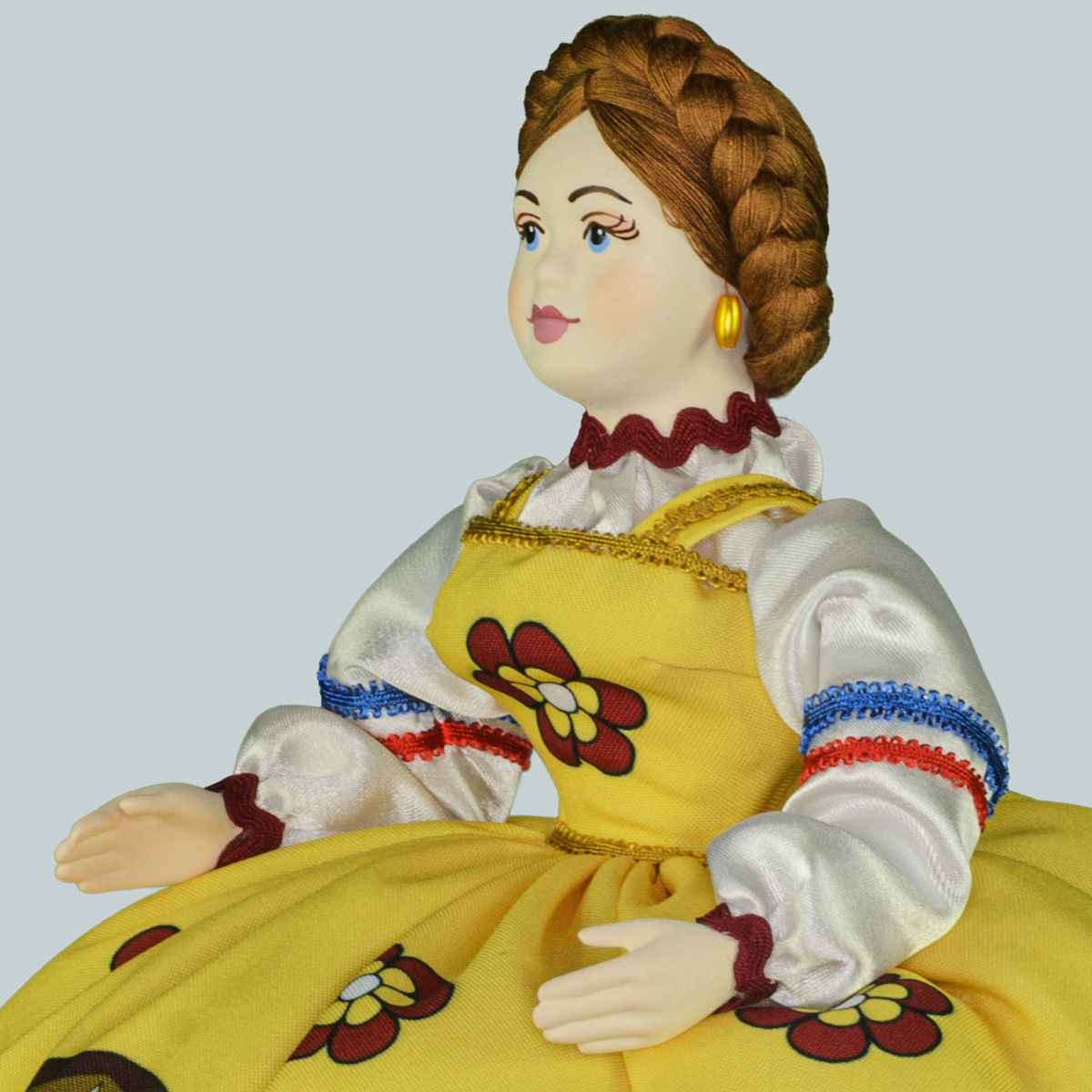 Баба на чайник сохранит тепло заварного чайника больших размеров для любителей чаепития. Высота 34 см, диаметр юбки 24 см. Швейные лекала, голова и руки отлиты из фарфора по нашим собственным наработкам, поэтому такая уникальная кукла баба на чайник будет только у вас.