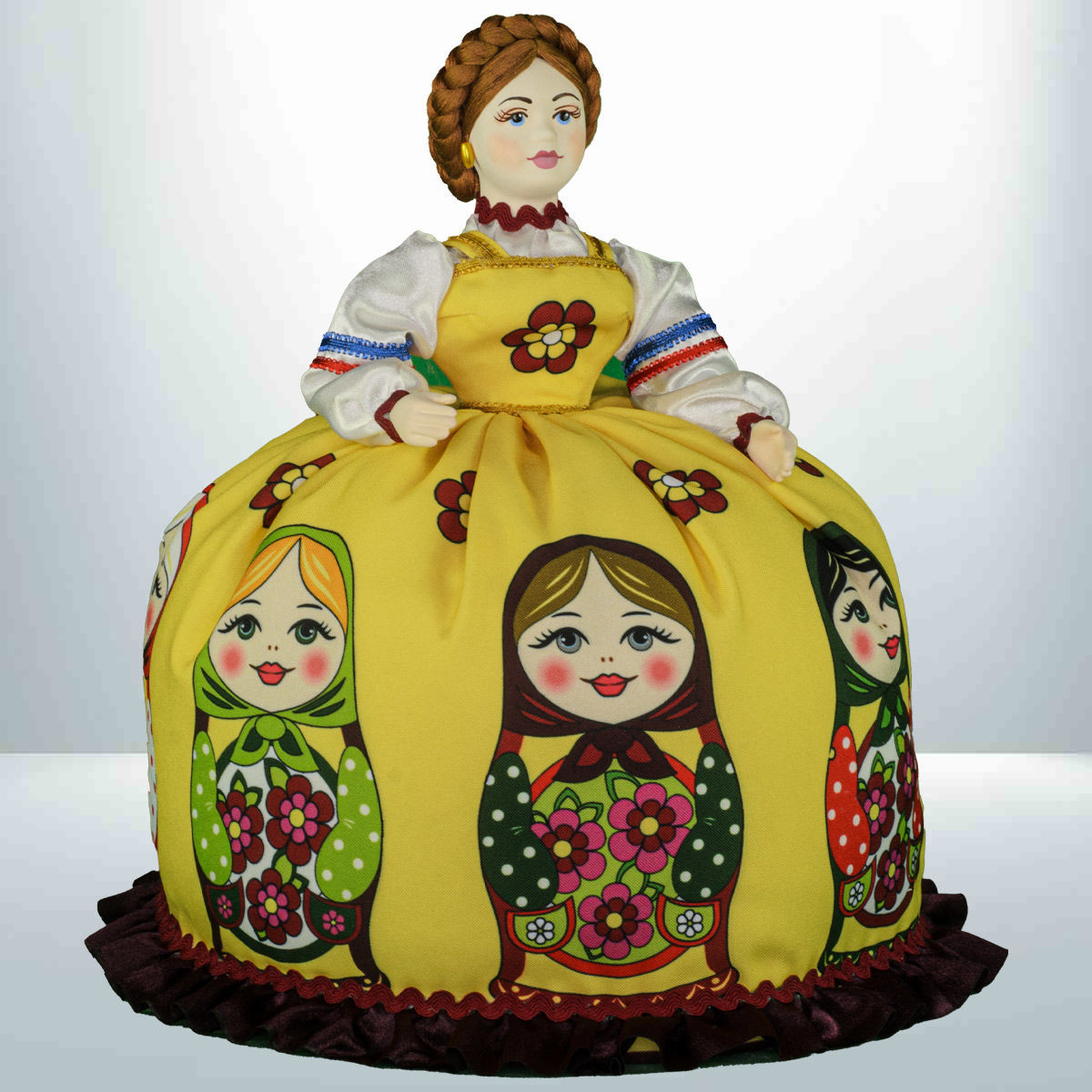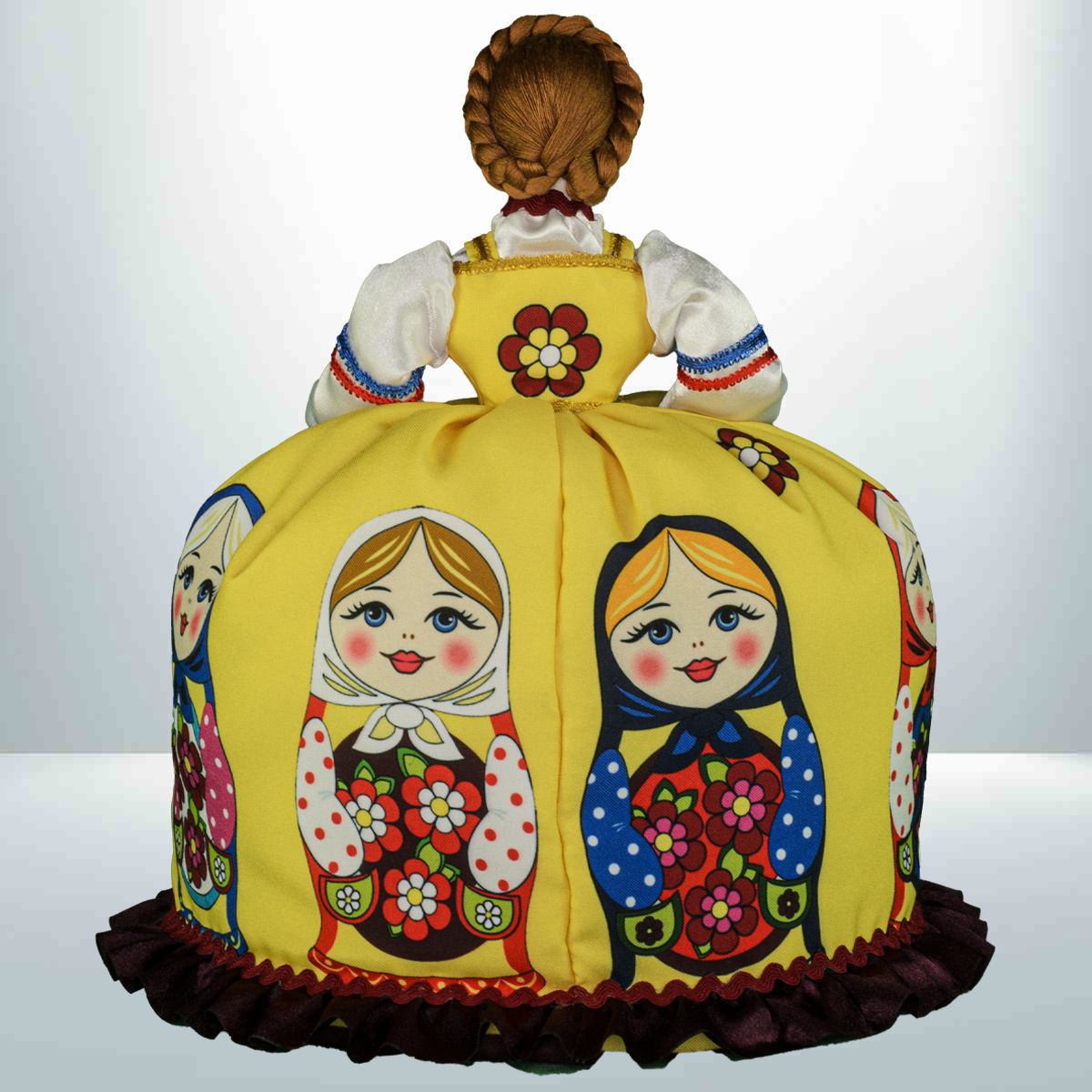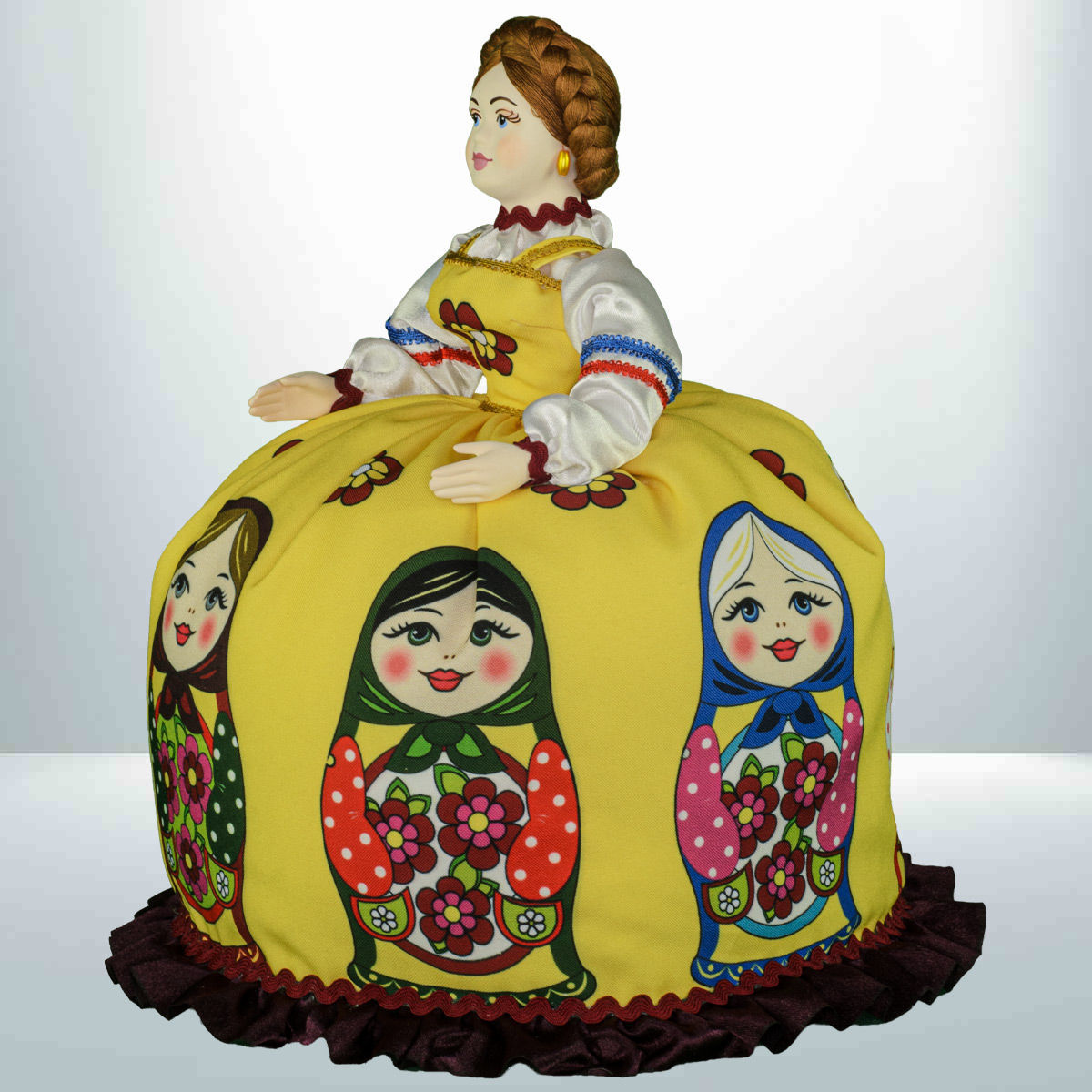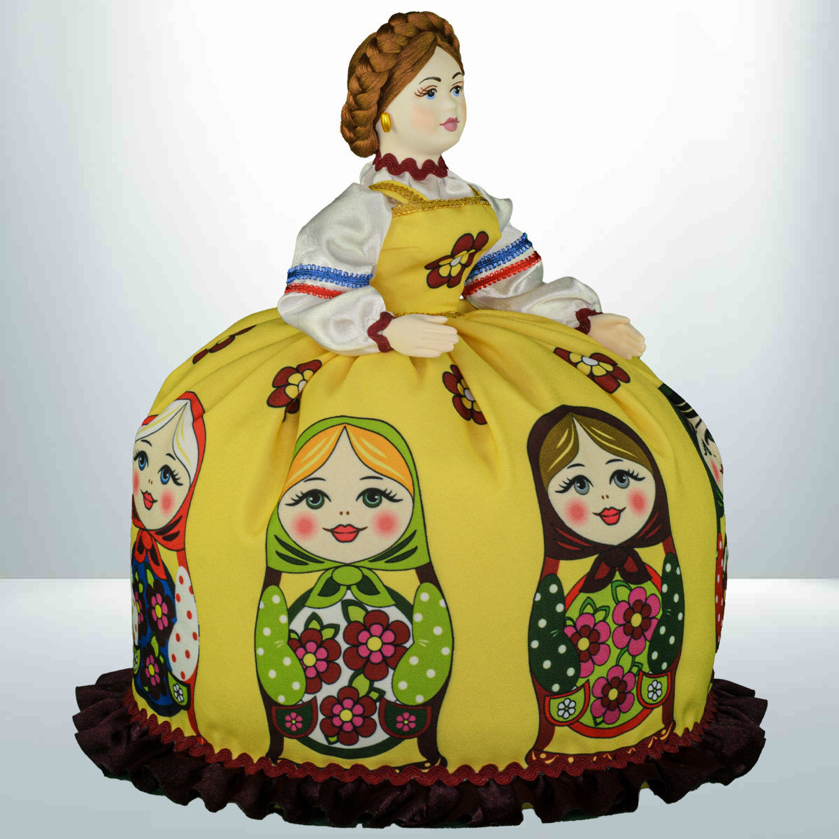 Кукла баба на чайник, сделано в России, Москва, мастерская «Кукла в подарок», модель 32, готовая работа. Авторская кукла грелка для чайника ручной работы. Оригинальный подарок в интерьер кухни в русском и украинском стиле. Юбка украшена изображениями славянской матрёшки.