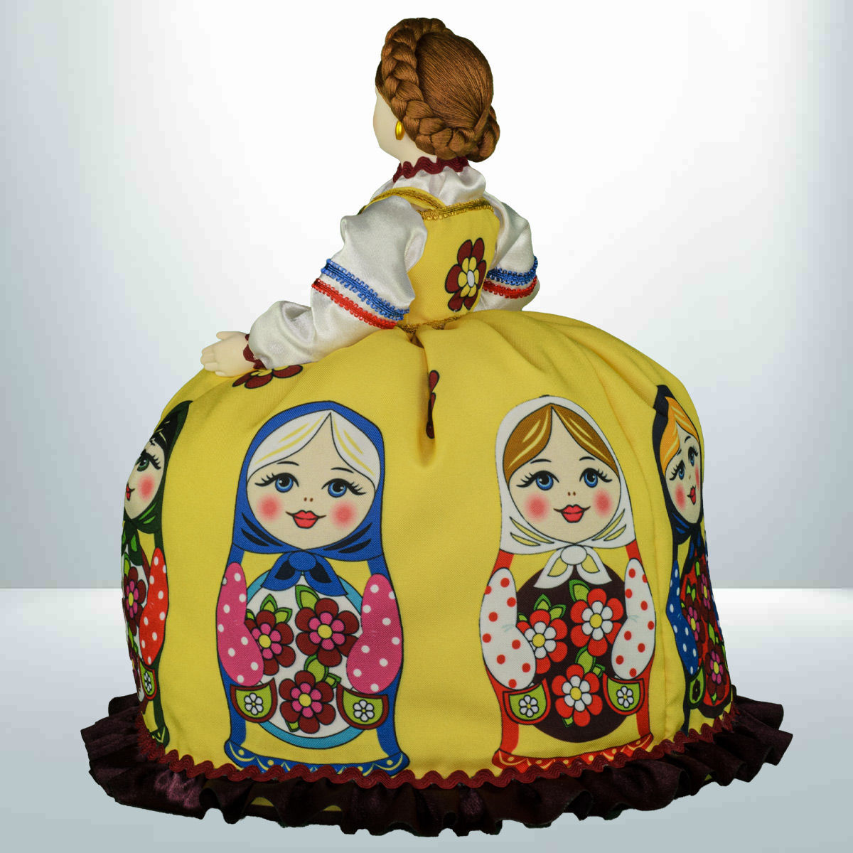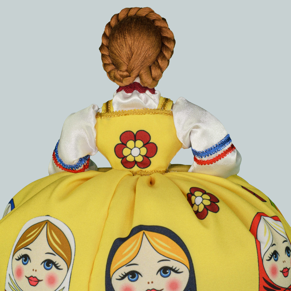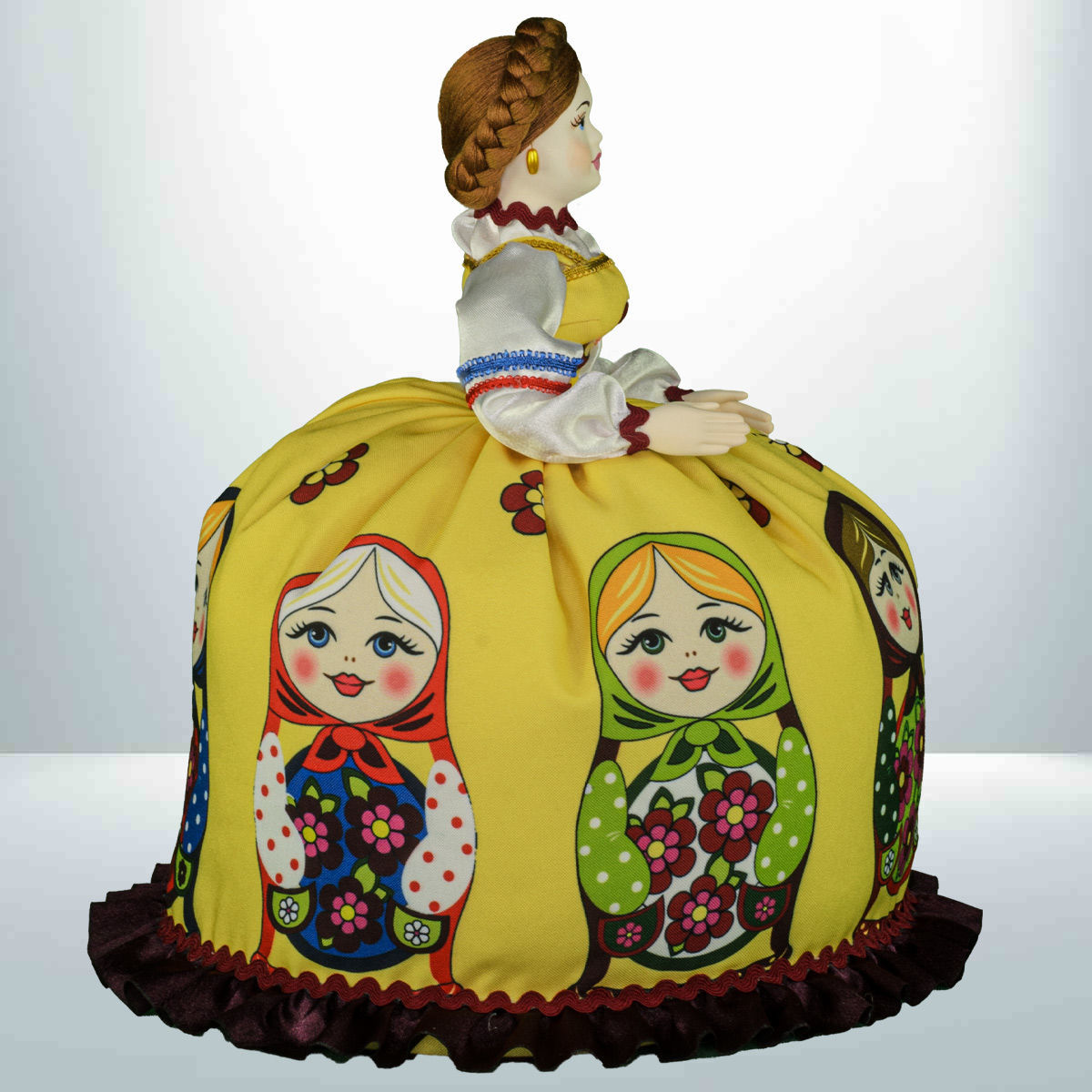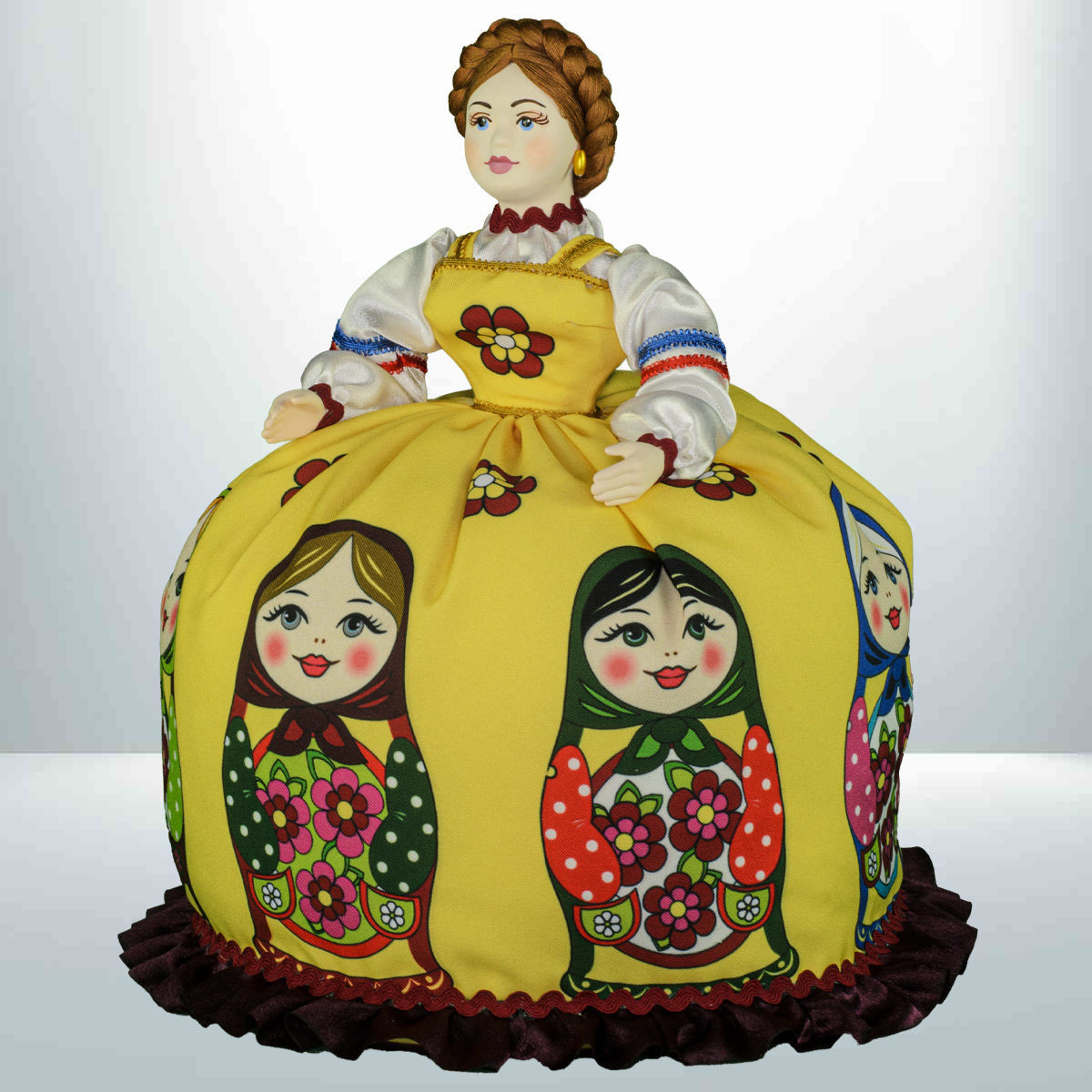 Кукла баба на чайник, сделано в России, Москва, мастерская «Кукла в подарок», модель 32, готовая работа. Авторская кукла грелка для чайника ручной работы. Оригинальный подарок в интерьер кухни в русском и украинском стиле. Юбка украшена изображениями славянской матрёшки.