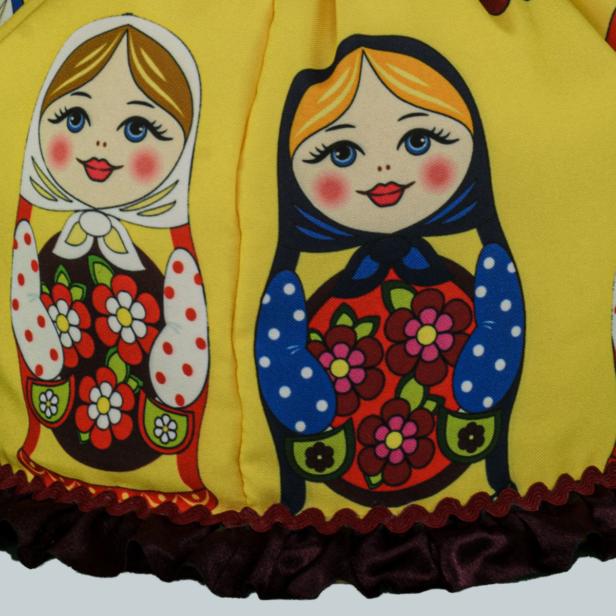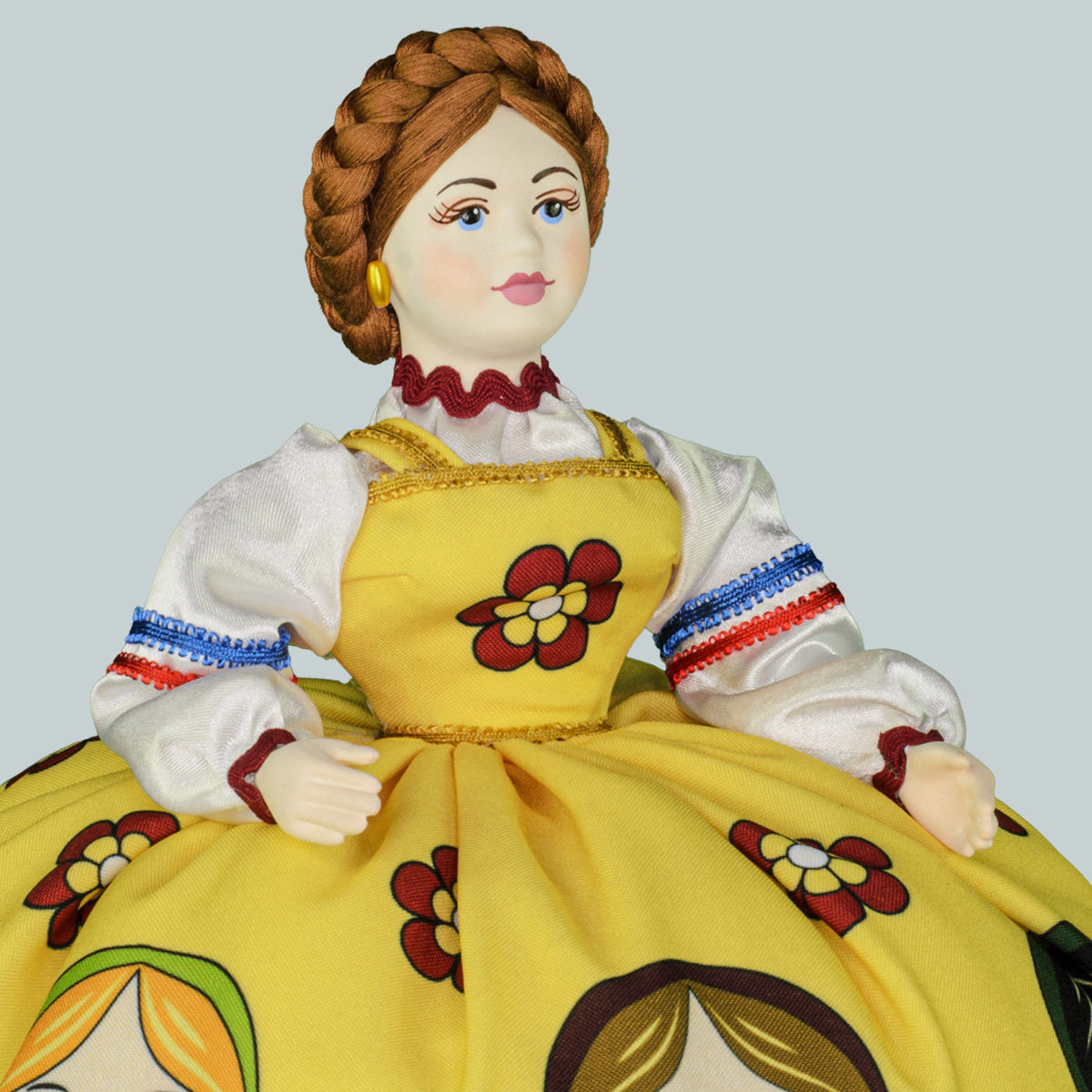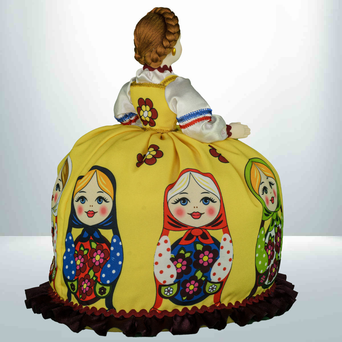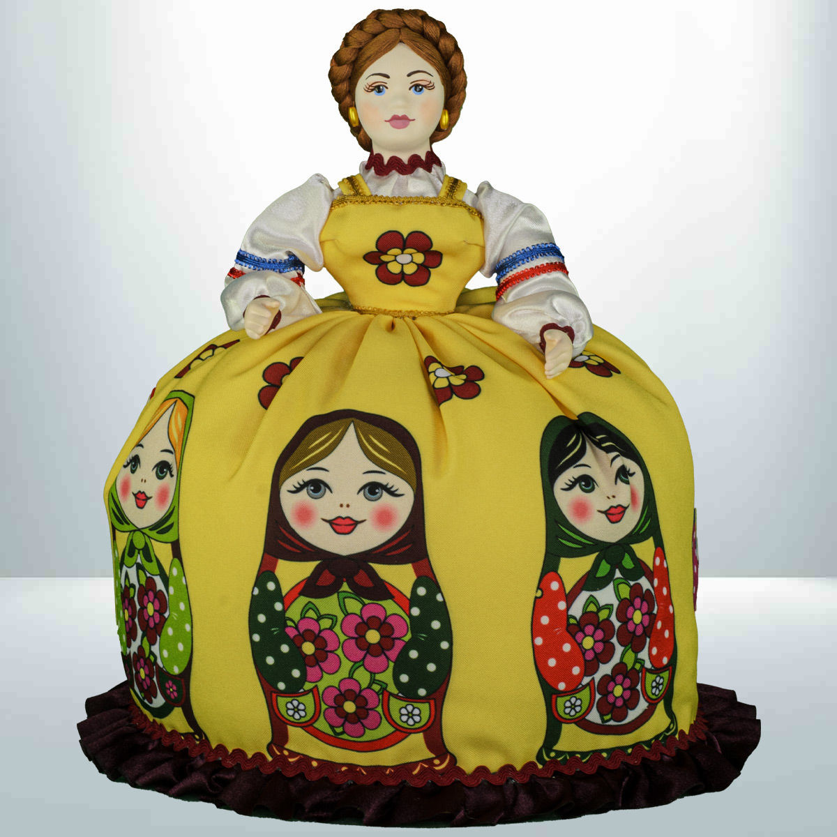 Кукла баба на чайник, сделано в России, Москва, мастерская «Кукла в подарок», модель 32, готовая работа. Авторская кукла грелка для чайника ручной работы. Оригинальный подарок в интерьер кухни в русском и украинском стиле. Юбка украшена изображениями славянской матрёшки.