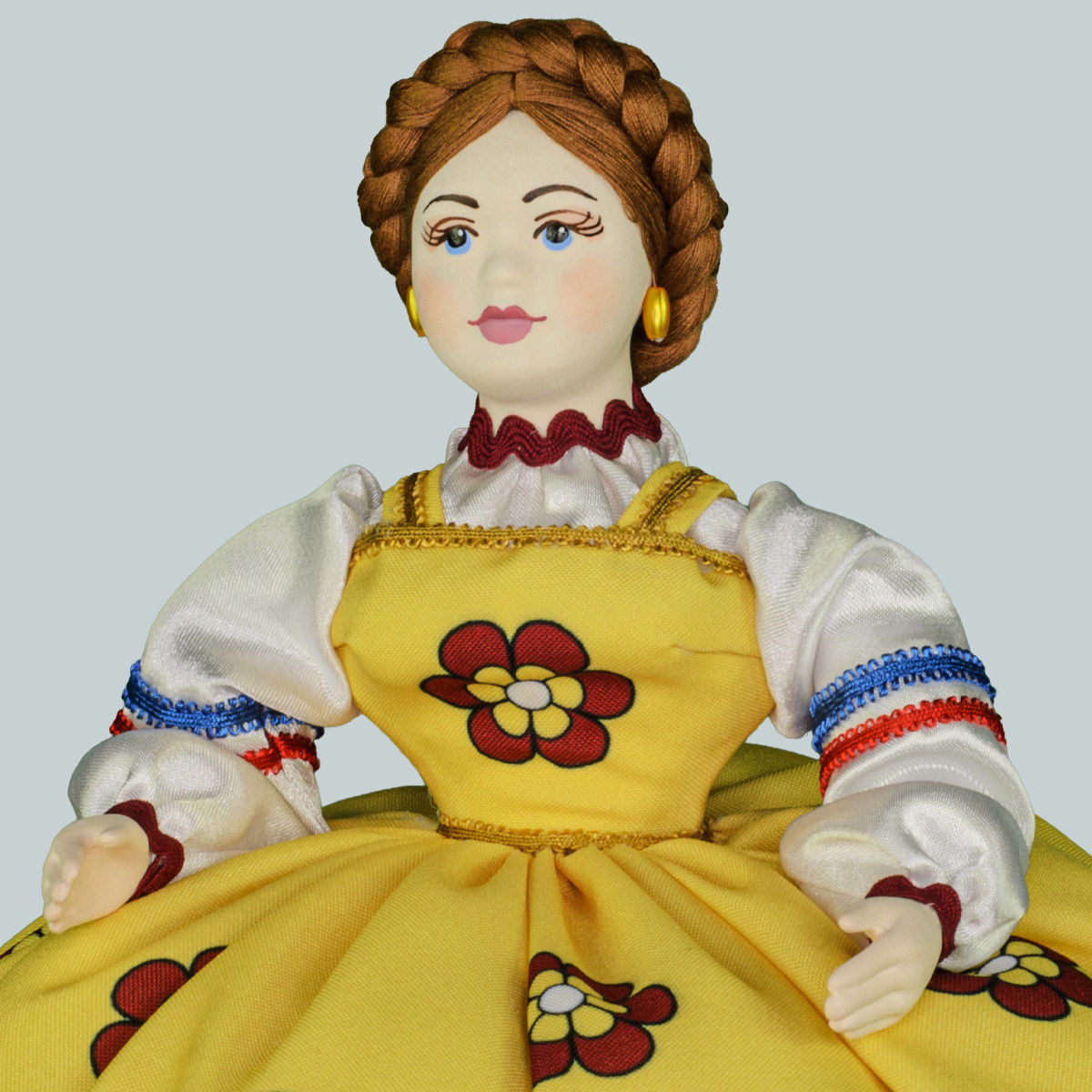 Голова и руки куклы баба на чайник отлиты из фарфора бисквит. Материал крепкий, но хрупкий, боится ударов, как любая чайная чашка. Лицо расписано вручную безвредными для здоровья акриловыми красками. Они, в отличие от масляных, не боятся воды или высокой температуры, со временем не растрескиваются и не меняют оттенок. Сохранить тепло чайника помогает безопасный для здоровья человека синтепон, которым простёгана юбка. Руки из фарфора на проволочном каркасе, их можно немного двигать. Все материалы и ткани новые, без запаха ароматизаторов или табака.